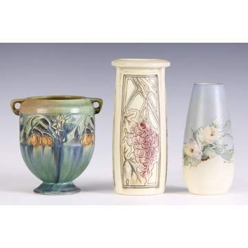 | Lot 214 - Roseville Baneda Handled Vase. Excellent. Ht. 7" Est. $200-$400 Lot 215 - Weller Vase w/Grape Design. Minor nick on bottom, otherwise very good. Ht. 10" Est. $100-$200 Lot 216 - Wellerware Vase w/Floral Dec. Artist sgn. Tight crazing, otherwise very good. Ht. 8" Est. $100-$200 |