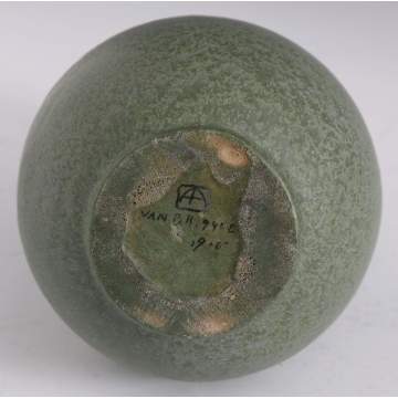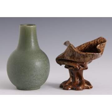 | Lot 218: Early Van Briggle Vase w/Green Matte Glaze. Sgn. Van Briggle, 1905, in ink. Excellent. Ht. 8" Est. $500-$800 Lot 219: Art Pottery Vase in George Ohr Style. Speckled brown glaze. Small chip in rim. Ht. 6 1/4" Est. $200-$300 |