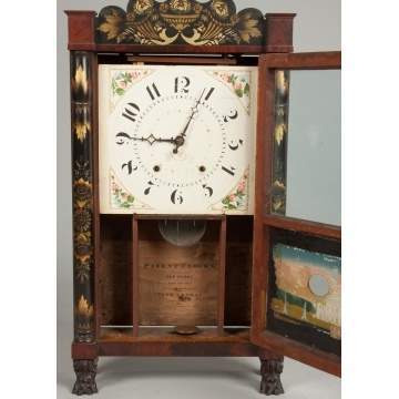 | Mahogany case; original stenciled columns & splat; paw feet; nice old finish. Original painted wood dial. Original reverse painted glass. 30 hour time & strike weight driven wood works movement. Good label. |