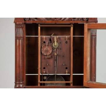 | Mahogany case with carved eagle crest & applied columns with pineapples; old finish. Original painted wood dial. Original tablet with glued print. 8 day time & strike wood works movement. |