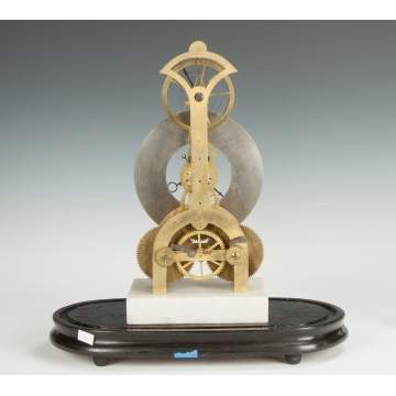 | 19th cent. With Eli Terry's patented vertically mounted balance wheel escapement & center sweep second hand. 8 day time only movement. Under a glass dome. A similar example picture in "Continental and American Skeleton Clocks" by Derek Roberts, page 201. |