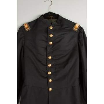 | Union frock coat & pants. Period photograph of him in his uniform, 4 3/4" x 2 3/4". Remington & Sons Pistol, Ilion, NY, USA, New Model, Pat. Sept. 14, 1858; original holster, belt & eagle buckle. Spencer Repeating Rifle Co., Boston, MA, Carbine. Eagle, brass hilted sword; etched. Rifle, marked Potsdam, Co. B 20, #19580, 2B, 12, 1R. Cartridge belt & strap with eagle brass plate. Cartridge box & brass eagle buckle. Gloves, horse's bit & spurs. Leather & brass sword straps. Platoon map & books, Cavalry tactics Vol. 1-3; Manual of Arms for 10th NY Cavalry. Diaries, Bible. Revised Regulations & for the Army, 1861. Instructions to mustering officers. Field desk & contents: The Crutch, “Soldier’s Newspaper”, Annapolis, MD, Feb 35, 1865. Instructions to mustering officers book. Muster out roles of people in Co. B. General orders from War Dept. Rank sheets; monthly reports; transportation papers & charges. Insurance paper: Power of Attorney from the office of George E. Leman; Alger & Square. Hospital papers. Handwritten special orders. Declaration, Office of Provost Marshal regarding slaves. NY State form from the Commessary General’s Dept. 20+ discharges. 90+ volunteer enlistments. Blank forms: Abstract of Rations & Lodging; Abstract of Articles Expending, Lost, Destroyed in the public service; blank discharge papers, volunteer forms, furlough papers, merchant vouchers, inventory of the effects, quarterly report of ordnance, muster roll, special requisition forms, etec. |