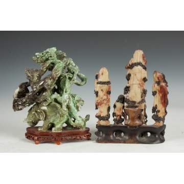 | Carved hardstone dragon, elephant, & foo dog. Carved soapstone figures, have been broken & reglued. |