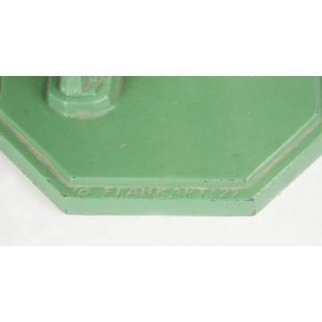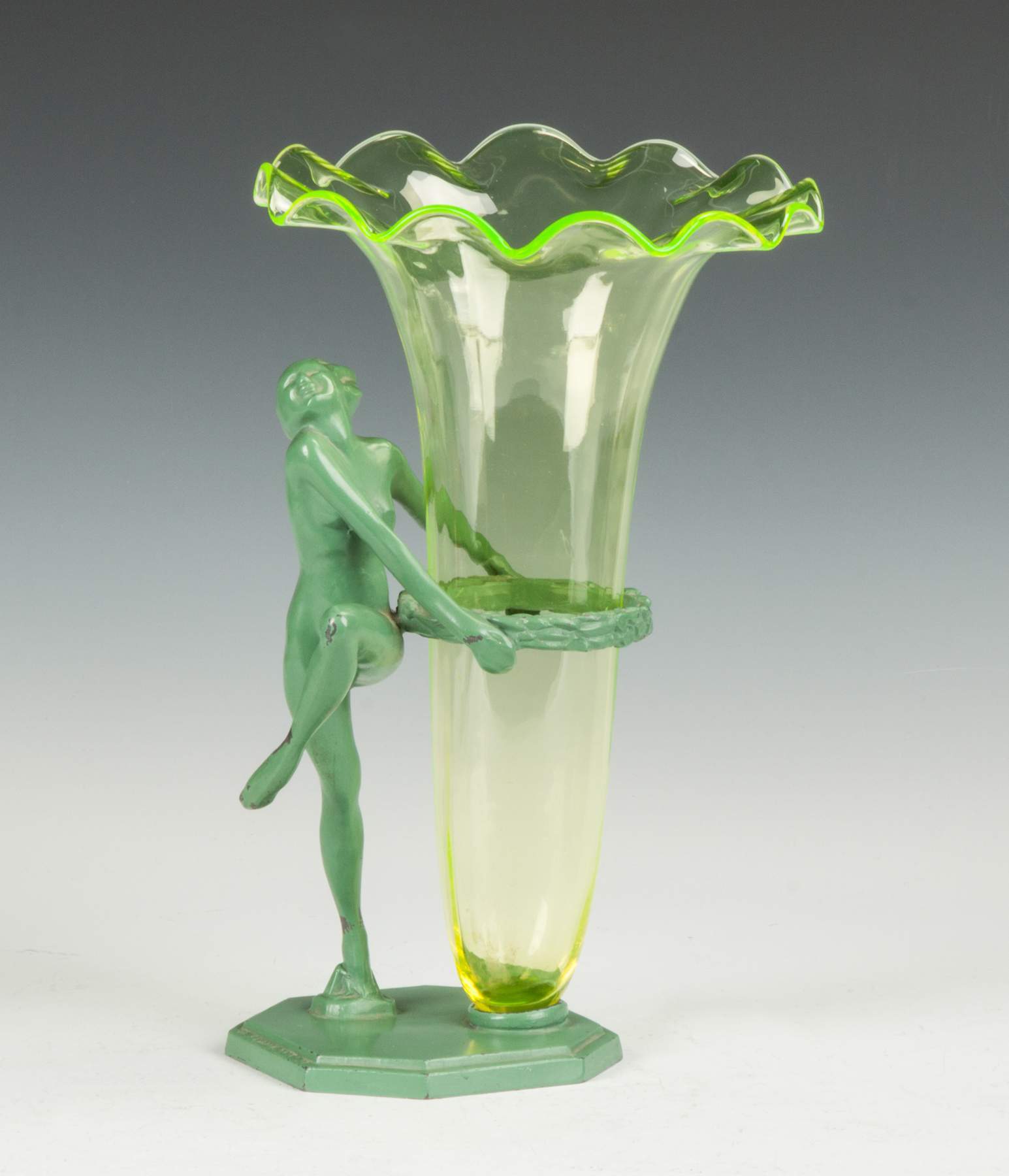 | Lot #: 430 Frank Art Patinated Metal Dancing Nude with Vaseline Glass Insert |