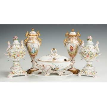 | All 19th cent. Dresden covered urns with cherubs, a few chips. French covered urns with gilt bronze mounts. Porcelain tureen with insects. |