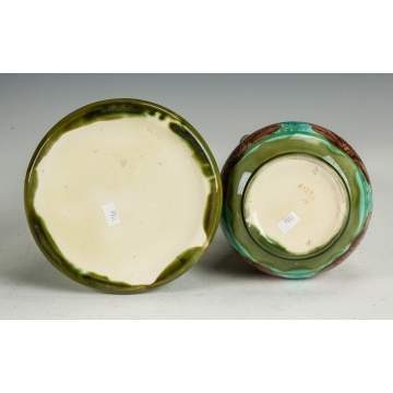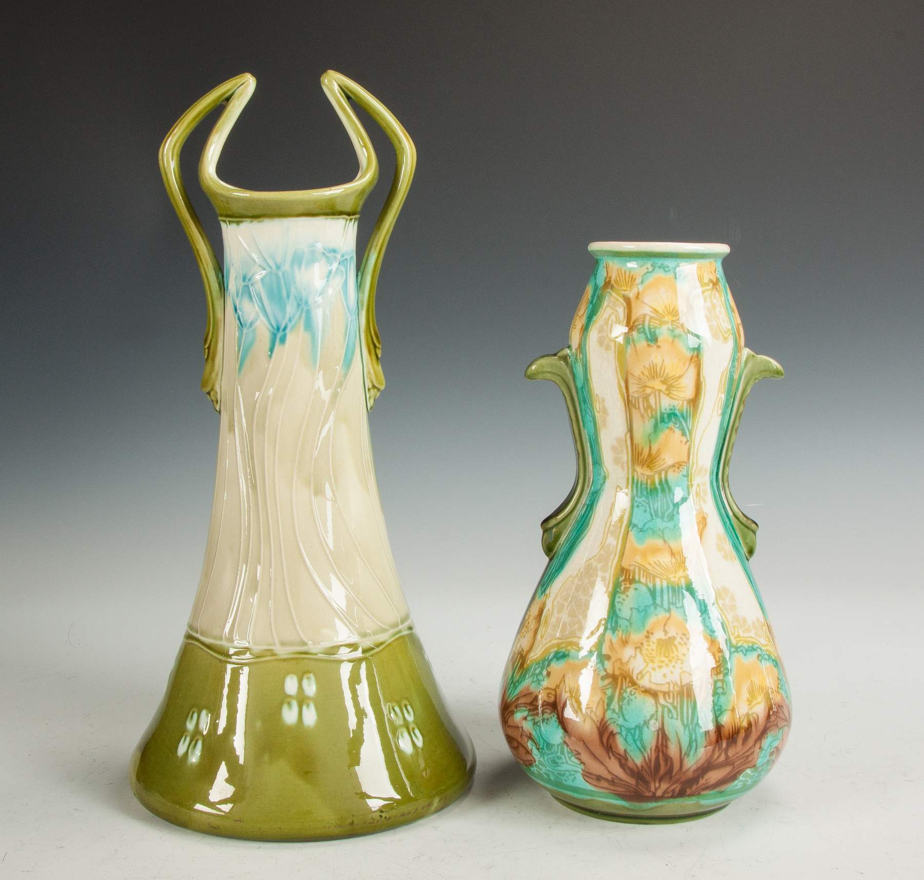 | Late 19th/early 20th cent. L: Handled vase, geometricized floral motif. R: Art Nouveau gourd shaped with poppy design. |