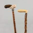 | 19th century. One with carved and painted mussel and coral carved handle with hammered and chased sterling cap; the other handle with three raised elements surrounded by beaded metal accents, carved shaft (missing ferrel). |