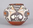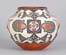 | Complex geometric and curvilinear polychrome design. Faint hairline in rim, about 2". Ht. 10 3/4" W 11" Est. $3,000-$5,000 |