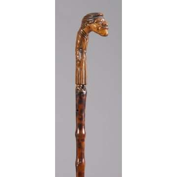 | Man w/cap, hands in pockets. Nice original patina, original ferrule, metal band repaired. Ht. 34 1/2" Est. $500-$800 |