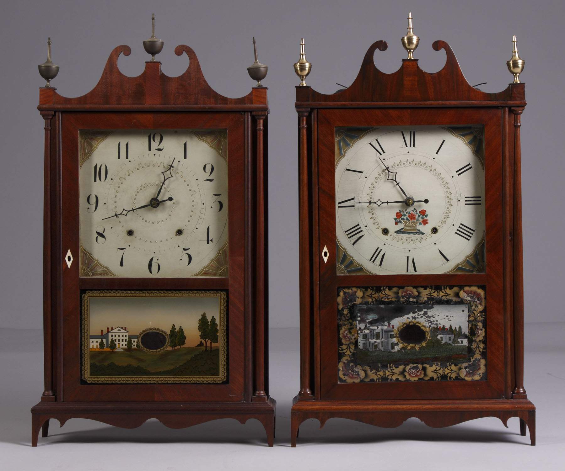 | Lot 243: L - Mahogany case in old finish. Old repair to crest. Finials not original.Original painted wood dial. Reverse painted tablet, professionally restored. 30 hour time & strike weight driven wood works movement. Nice label. Ht. 31" Est. $700-$1,000. Lot 244: R - Mahogany case in nice old patina. Original painted wood dial. Reverse painted tablet, professioanlly restored. 30 hour time & strike weight driven wood works movement. Ht. 31" Est. $700-$1,000. |