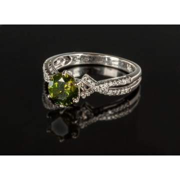 | 1. Gold & Green Diamond Ring. One round brilliant cut diamond, measuring approx 6.6 x 4.2 mm, 1.22 ctw; Clarity SI-2; Color slight yellow/green. 44 round brilliant cut diamonds, approx. 0.25 ctw; clarity I-1 - I-2; Color H-J. 3.14 grams. 2. Gold & Blue Diamond Ring. One round brilliant cut diamond, measuring approx 5.15 x 3.1 mm; approx. 0.72 ctw; faint blue fluorescence; Clarity I-1; color very slightly green/blue. Four round brilliant cut diamonds, approx. 0.25 ctw; Clarity VS-2 - SI-2; color H-I. 2.53 grams. |
