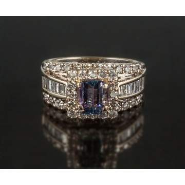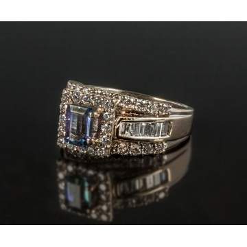 | Raised square halo setting with emerald cut tanzanite, measuring approx. 1.06 cts.; 6.7mm x 4.86mm; color, moderate tone of bluish violet; clarity, MI-2 (moderately included). Two outer rows of diamonds have 12 round brilliant cut diamonds and the halos has 16. This total of 40 diamonds is approx. 0.85 ctw; average clarity I-1; average color H-I. Center row has 7 baguette diamonds on both sides of center, 14 total; approx. 0.5 cts; average clarity SI-3; average color H-I. 8.48 grams. |