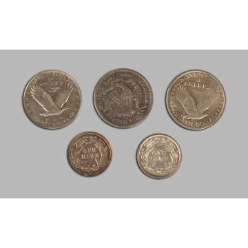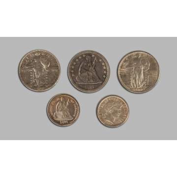 | 1920 Standing Liberty quarter. 1877 CC Seated Liberty quarter. 1917 I Standing Liberty quarter. 1876 Seated Liberty dime. 1892 Barber dime. |