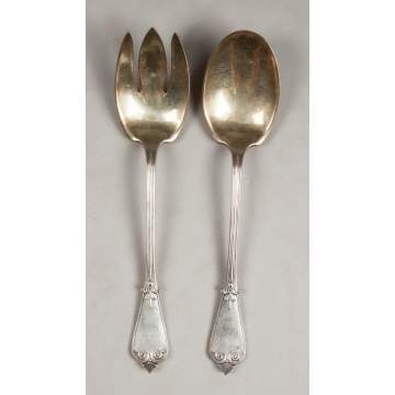 | 27 pieces. 41 ozt. monogrammed. 6 knives, 9 1/2". 4 forks, 7 3/4". 6 forks, 7 1/4". 2 bouillon spoons, 7 5/8". 1 teaspoon, 6". 6 Dominick & Haff teaspoons marked 'Cartier', L 6 1/4". Serving spoon & fork, L 9 3/4". |