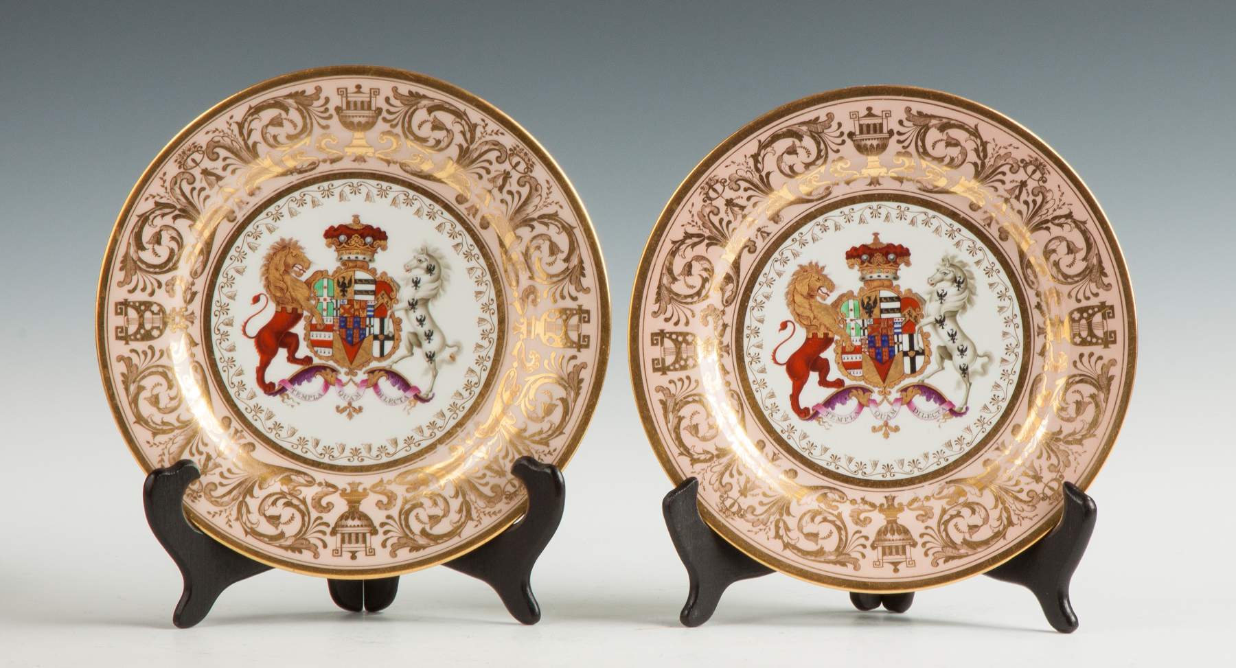 | Lot #: 486 Two Worcester (Flight, Barr & Barr) Armorial Salmon-Ground Plates from the 'Stowe' Service |