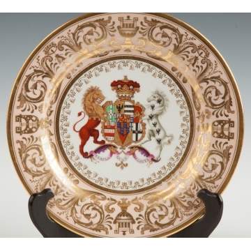 | C. 1813. Finely painted with the full arms of the Marquis of Buckingham and motto 'Templa Quam Dilecta'. The salmon border gilt with neoclassical motifs. Red circular printed Flight, Barr & Barr/Royal Porcelain Works Worcester/Manufactures to their Majesties and the Prince Regent mark, impressed crown and FBB mark. See John Sandon, The Dictionary of Worcester Porcelain, colour plate 79, p. 321 for a selection of pieces from the service. |