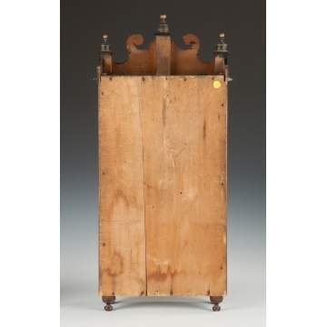 | Mahogany case, original surface; turned feet, stenciled crest and turned finials. Dial is old professional repaint. Retains original reverse painted tablet, some paint loss. One day wood works movement. There is an article about this clock maker in a 1938 issue of the Magazine Antiques. |