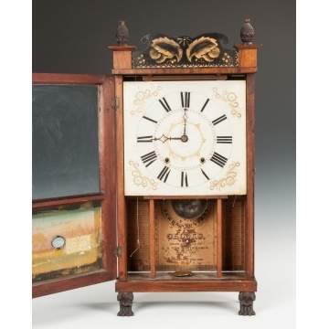 | Mahogany case w/carved paw feet & finials, stenciled splat & columns. Original painted wood dial. Original reverse painted glass. 30 hour time & strike weight driven wood works movement. |