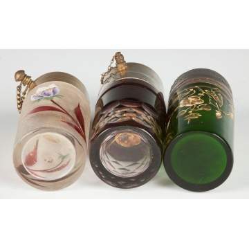| Early 20th cent. Enameled with flowers, small fleck to base. Cut glass with cranberry overlay. Emerald green with enameled flowers. |