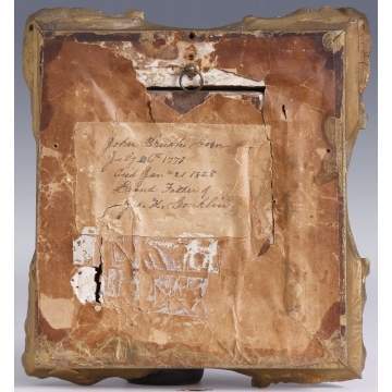 | Early 19th Cent. Miniature on Ivory ,Man in blue coat. Original carved gilt wood frame. Text on reverse. Very good. Painting size: 3" x 2 1/2" Est. $500-$800 |