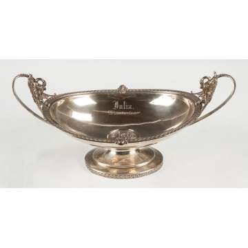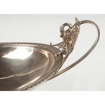 | 19th cent. 900/1000 silver. Stylized swan handles; hand chased border. Inscribed on interior. 28 ozt. |