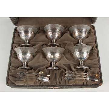| Sherbet cups with cut glass inserts & spoons. Spoons monogrammed. 10 ozt weighable. Original case, wear. Cup Ht. 2 1/2" Dia. 3"; Spoon L 5 1/4". Dominick & Haff sherbet cups with cut glass inserts. Monogrammed. Missing one glass insert. Cup Ht. 2 3/4" Dia. 3 3/4" |
