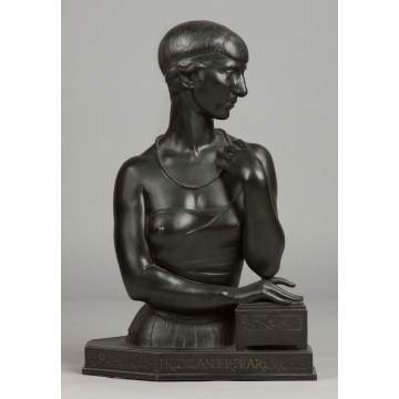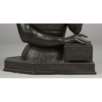 | Inscribed "Rhoda Frieda Friedlander Pearl Mother. Artist, wife of sculptor Leo Friedlander, AD, MCMXXIV." Leo Friedlander exhibited drawings at the Art Students League in New York when he was only twelve years old. He worked as a modeler in an ornamental shop for many years, then studied in Brussels, Paris, and Rome before returning to New York. He is best known for his colossal public monuments, including the equestrian statues Valor and Sacrifice at Washington's Memorial Bridge, and the thirty-three-foot figures representing the "four freedoms" (speech, press, religion, and assembly) created for the 1939 New York World's Fair. Friedlander was the architect of monuments. His projects were colossal in scope. Unlike his peer Paul Manship, he did very little studio work. This bronze was first exhibited in the early fifties at both the National Academy of Design in new York and the Pennsylvania Academy of the Fine Arts in Philadelphia. In 1984 it was exhibited in a retrospective of the artists work at the Hudson River Museum: “Sculpture on a Grand Scale: Works From the Studio of Leo Friedlander”, and was illustrated in the catalog. |