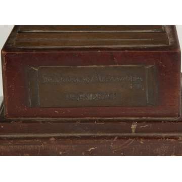 | Sgn. Paul Manship Sculp., June 1944. Bronze bust. A small terra cotta portrait relief of Sir Douglas Alexander by Manship is in the collection of the Smithsonian American Art Museum. This bronze was loaned to the Cornish Colony Museum in 2006 and exhibited in a cataloged retrospective that also included the work of William Zorach and Maxfield Parrish. The exhibition was curated by noted Parrish Author and Scholar Alma Gilbert who was a Founder of the Museum and its Director at the time. Foundry mark, Roman Bronze Corp NY. |