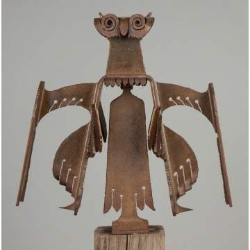 | Lot #: 213 Albert Leon Wilson (Rochester, NY, 1920-1999) Cut Steel Stylized Owl on Wood Base |