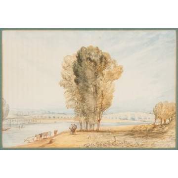 | Attr. to Peter de Wint, sgn. in pencil on reverse. River with bridge, figures, cows. Watercolor. |