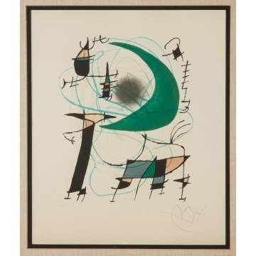 | Both sgn. lower right, Miro. Initialed lower left, H.C. Titles: "Green Moon" & "Singing Fish". |