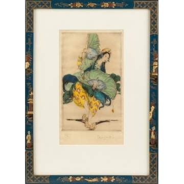 | C. 1931. Sgn. lower right, Elyse Lord, #lower left 49/50. Drypoint & woodcut on silk with original lacquered frame. |
