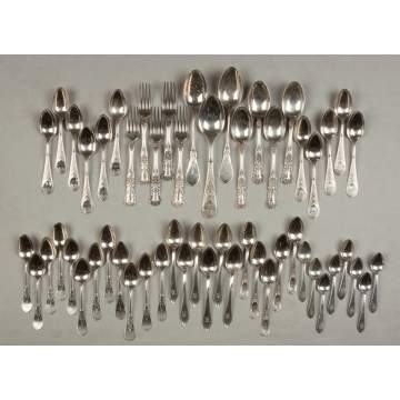 | Total: 54 pieces, 45 ozt. weighable. Some monogrammed. Mostly Gorham, some Dominick & Haff & Towle. Serving spoon, L 8 1/2"; 4 Serving spoons, L 7"; 2 Serving spoons, L 8"; 11 teaspoons, L 5 7/8"; 12 Teaspoons L 5 1/2"; 6 teaspoons, L 5 7/8"; 5 Spoons, L 5 3/8"; 8 demitasse spoons, L 5 1/4"; 5 Forks, L 7". |