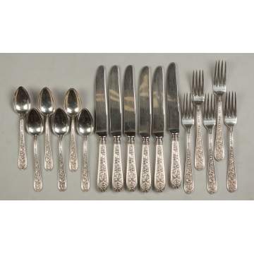 | Total: 17 pieces, 14 ozt. weighable. 6 Knives, L 9". 5 Forks, L 7 1/4"; 6 Teaspoons, L 5 7/8"; |