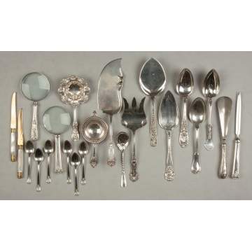 | Photo 1: Sterling Silver Spoons & Knives incl. Tiffany & Gorham. Total: 29 pieces, 9 ozt. 12 Knives, L 8 3/4"; Serving spoon, L 8 1/2"; 2 teaspoons, L 5 3/4"; Square spoon, L 6"; Pointed spoon, L 5 1/2"; 12 Demitasse spoons, L 4 1/4". Photo 2: Various Sterling Silver Serving Pieces incl. Gorham, Reed & Barton, Towle, S. Kirk & Son. Total: 22 pieces, 28.1 ozt. weighable. 2 Magnifiers, L 7 1/4". 1 Letter opener, L 9 1/4". 1 Shoe horn, L 9". Knives, spoons, demitasse spoons, etc. |