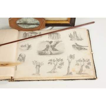| Letter opener, wood mirror, sketch book & sketch, carved bone back scratcher. |
