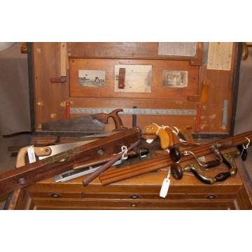 | Drill braces, saws, level. Together with group of various drill bits, tools, sharpening stones, pliers, etc. |