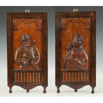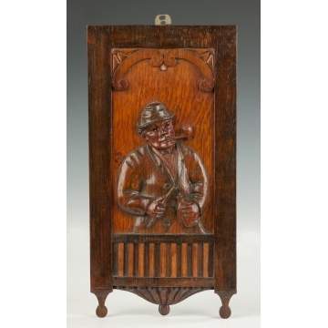 | C. 1920's. 1/4 sawn oak. Of Gentleman smoking pipes, one holding book, one holding bottle. |