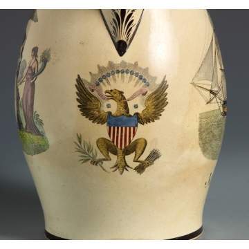 | 3 Masted Ship "John Ladd"; American flag & eagle, Peace, Plenty & Independence. No repairs or restoration. Faint 2" hairline in rim. Small chip in base. Ht. 11" Max W 11" Est.$1,000-$1,500 |