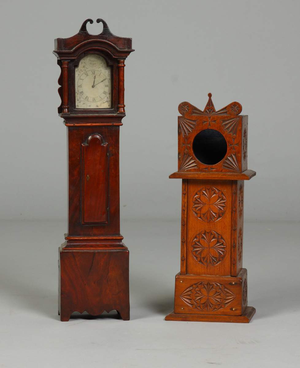 | 384.Miniature Mahogany Watch Hutch Clock,Early 19th Cent. Silver dial, 8 day balance wheel French movement, #2774, Tempus Fugit.Nice patina. Ht. 16 1/2" Est.$500-$800 385.Maple Chip Carved Watch Hutch,Early 19th Cent., probably PA.Old finish. Ht. 12 1/2" Est.$400-$600 |