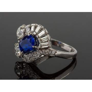 | Palladium setting. AGL report CS 1076637. Natural Corundum sapphire; 2.72 cts; 8.35mm x 6.31mm x 5.33mm. Also set with 11 old European cut diamonds and 3 round single cut's, approx. mounted total weight 0.34 cts. Six straight baguettes, approx. mounted total weight 1.37 cts. Two old European cut diamonds measuring approx. mounted total weight 1.37 cts.; Mounted diameters 5.6mm to 5.78mm and 5.56mm to 5.72mm. Average mounted clarity, internally VVS, both with small nicks around the edge; estimated mounted colors, J & K. Weight 5.8 grams. |