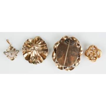 | L to R: 14K gold, diamond and pearl pendant/pin. 14K Leaf pin/pendant w/diamond sgn & # illegible. 14K gold pin with miniature. 14K gold pin with diamond. 8.5 dwt weighable. |