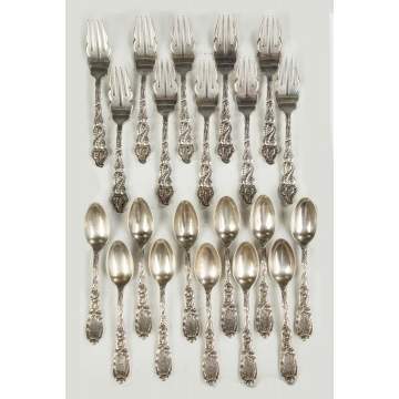 | 12 knives, L 9". 10 Ailanthus forks, L 6". 11 Chrysanthemum spoons, L 5 3/4", monogrammed. 1 knife, L 10". 33 ozt weighable. |