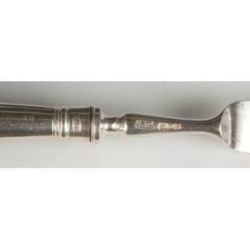 | 12 forks, L 7 1/4"; 6 forks, L 6 1/2". Monogrammed. 29 ozt. Makers mark LAC. |