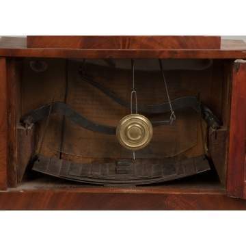 | Early 19th cent. Figured mahogany case with turned columns. Old, professionally restored painted metal dial. Zinc bezel. Glass is old, but not period. 8 day wagon spring brass movement. Original label. |