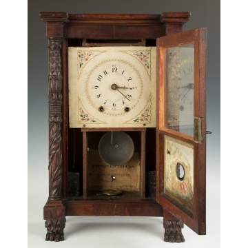 | Mahogany case; carved columns and paw feet; old finish. Original painted dial with winding arbor holes plugged. Original reverse painted tablet. 30 hour weight driven movement has been recreated. Good label. |