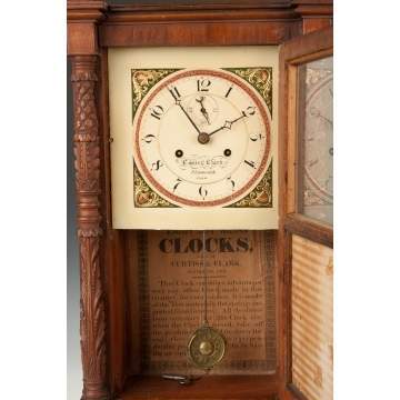 | Numbered 87. Figured mahogany case with carved columns and carved paw feet. Original dial has been refreshed. Professionally repainted lower glass. Time and strike movement with second bit hand. Good clean label. |
