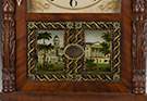 | Mahogany case with expertly carved columns, fruit crest and paw feet; old finish possibly original. Outstanding original painted wood dial. Original, exceptional double reverse painted tablet. 30 hour time and strike wood works movement. Illustrated |