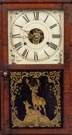 | Rosewood case, original smoked and gilded half columns; original finish; minor loss to veneer on base. Original painted metal dial. Original reverse painted tablet with deer. 8 day time, strike and alarm weight driven brass movement. |