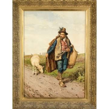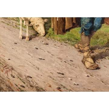 | Lot #: 516 Filippo Indoni (Italian, 1842-1906) Bagpipe Player with Sheep |